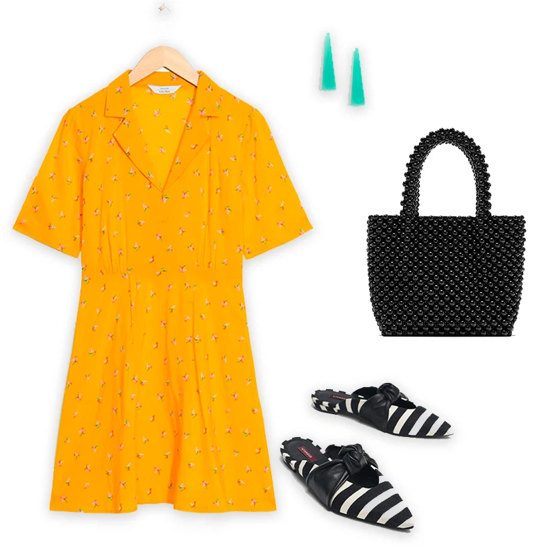 Tropical flower skater dress, €69 at stories.com, striped mules with knot detail, €115 at uterque.com, beaded mini tote bag, €29.95 at zara.com, plastic geometric drops earrings €13 at topshop.com