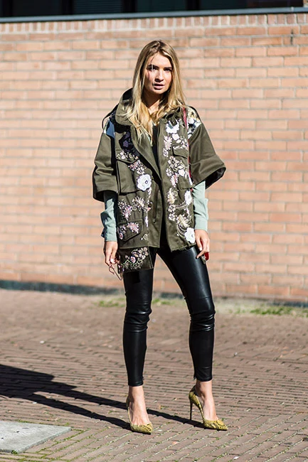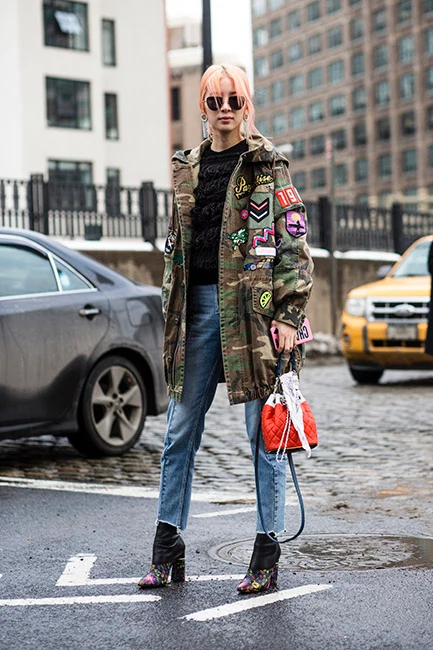 Adding badges to an army jacket can bring individuality to your outfit, but for a fresher look, contrast feminine embellishments with military-style detailing. Great style is often grounded in clever contrasts.