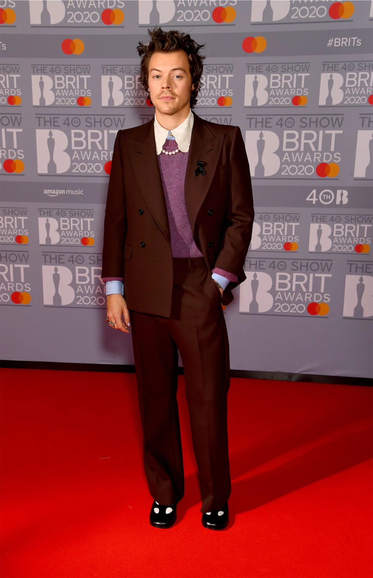 Harry Styles was also on-trend in a Gucci FW20 suit, complete with a pearl necklace and an XXL lace bib collar. He also wore a black lapel in tribute to Flack, whom he used to date.