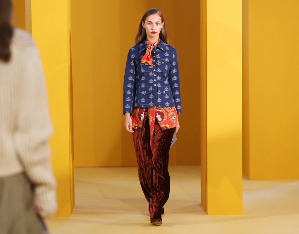 The 70’s are back and they’ve brought an entire capsule wardrobe with them. Dior, Celine and Isabel Marant brought us a wide selection of 70’s-esque outfits — big-shouldered blazers over pussybow blouses and colourful skirts to finish them off. One outfit from Chloé particularly struck the audience today, featuring burgundy velvet flares, a red scarf-patterned shirt and cropped navy blazer.