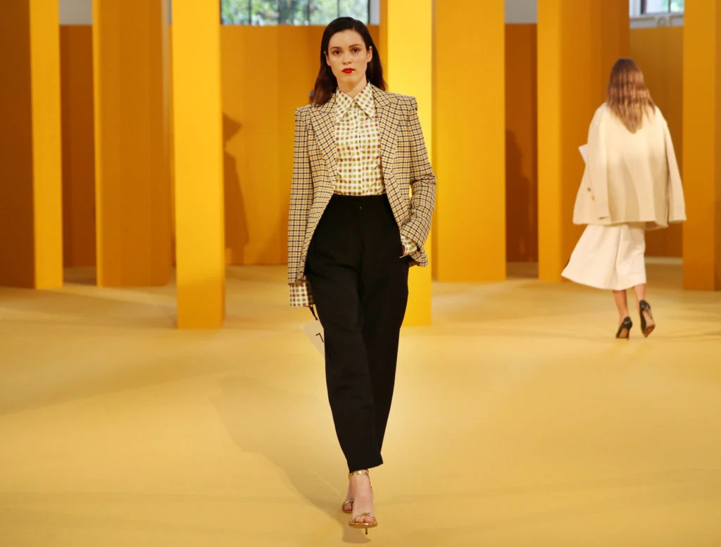 Yesterday, stalwart of the Irish fashion scene Brown Thomas brought their bi-annual new season preview to a new location. While traditionally always on the shop floor of their headquarters on Dublin’s Grafton Street, 2019’s AW preview saw a new setting in Trinity College Dublin’s public theatre. The high ceilings and traditional artwork and architecture were punctuated with tall graphic structures at the beginning of the catwalk — a perfect nod to the old-meets-new theme of the new collection.
