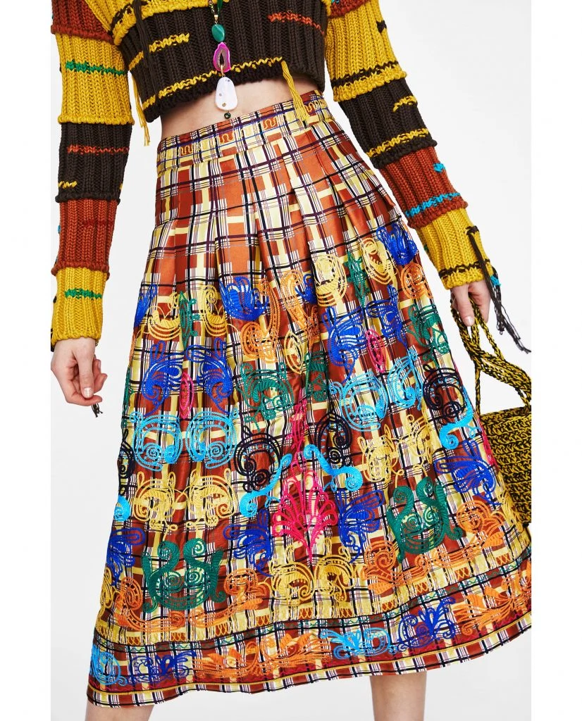 I love how Zara have styled this studio embroidered skirt with stark contrasting colours and textures that play on the skirts motif. It’s as though a box of Crayola was let loose on your mother’s favourite skirt and the result is a colourful explosion: it’s busy, yet elegant and sophisticated. Wear a plain burnt-orange T-shirt or blouse to keep the focus on the skirt. However, if plain-jane isn’t your style and you want to experiment with texture a bit further, a cropped knit (as seen above) is another great choice. It might be unusual to see knitwear worn for spring and summer, but I bet it’ll come in handy here.