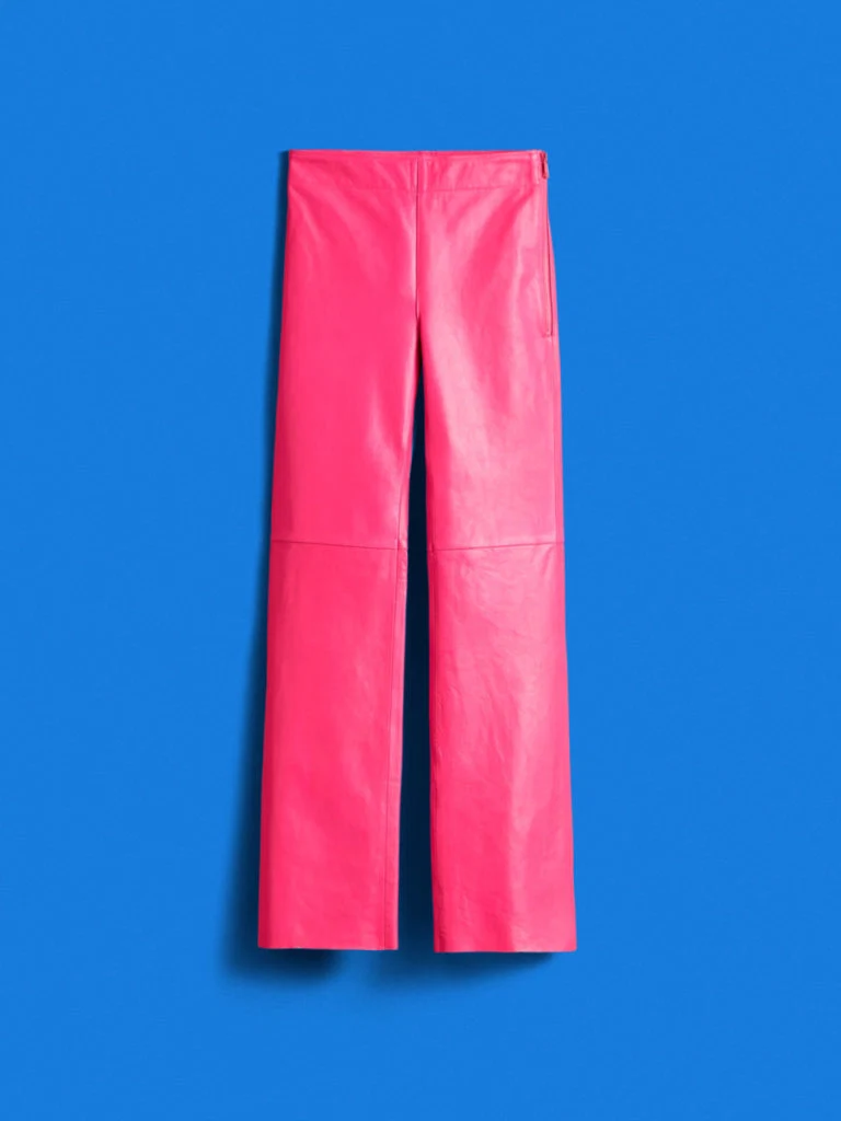 Our top picks from the collection include the hot pink leather trousers which are perfect for spring nights out; the white leather platform boots which will act as the perfect excuse for us to shed our winter boots and the teal satin dress – utterly modern but completely wearable.