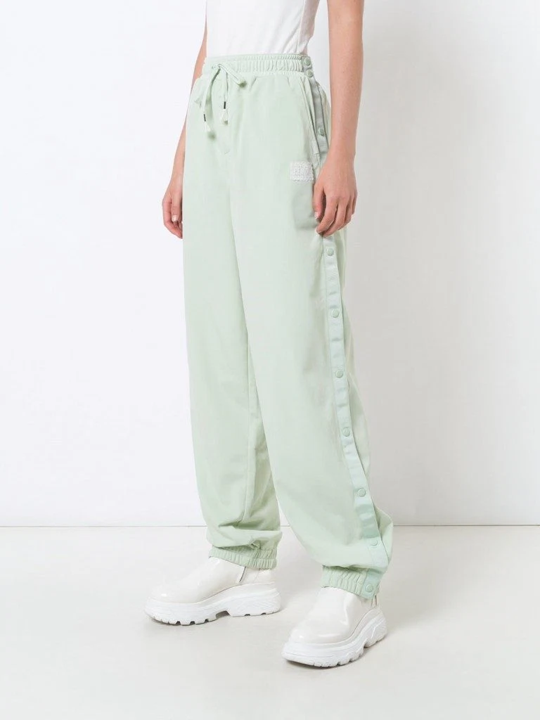 Minty-green freshness with Fenty X Puma.?Done up in fine tricot with tearaway side seams trimmed in satin ribbon or jacquard and Fenty Puma -stamped snap buttons, these comfy track pants boast an opulent edge. No wonder they’re a collection favourite?and worn by Rihanna. Shop the look here for €325.