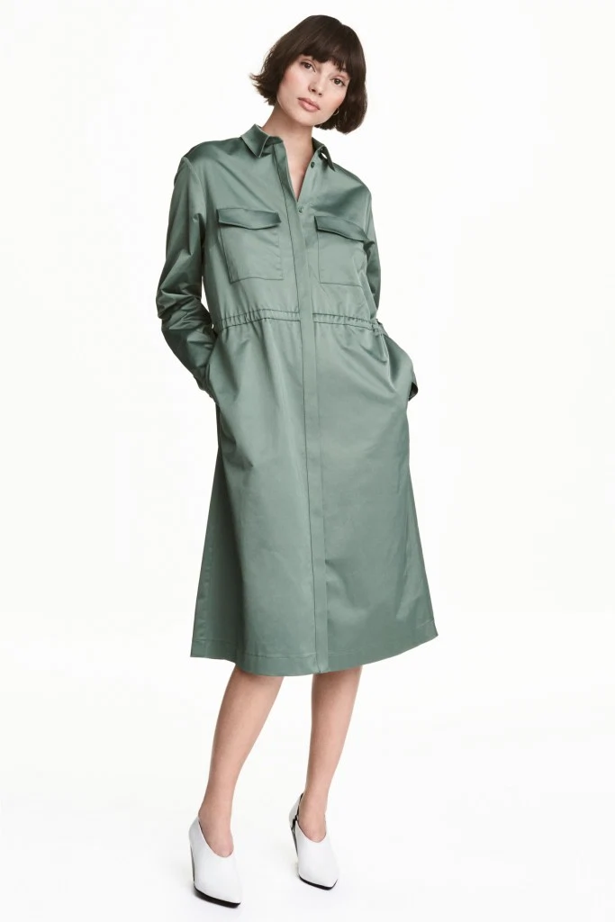 H&M has been especially strong the last couple of seasons. I love this unfussy’shirt dress from its?new collection. The fabric has a satin sheen, which contrasts nicely with the utilitarian nature of the piece, and the dress?has a drawstring waist if you prefer a more fitted silhouette.