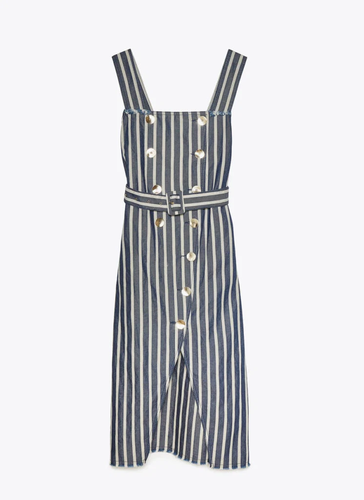 Striped dress with gold buttons, €125 at uterque.com