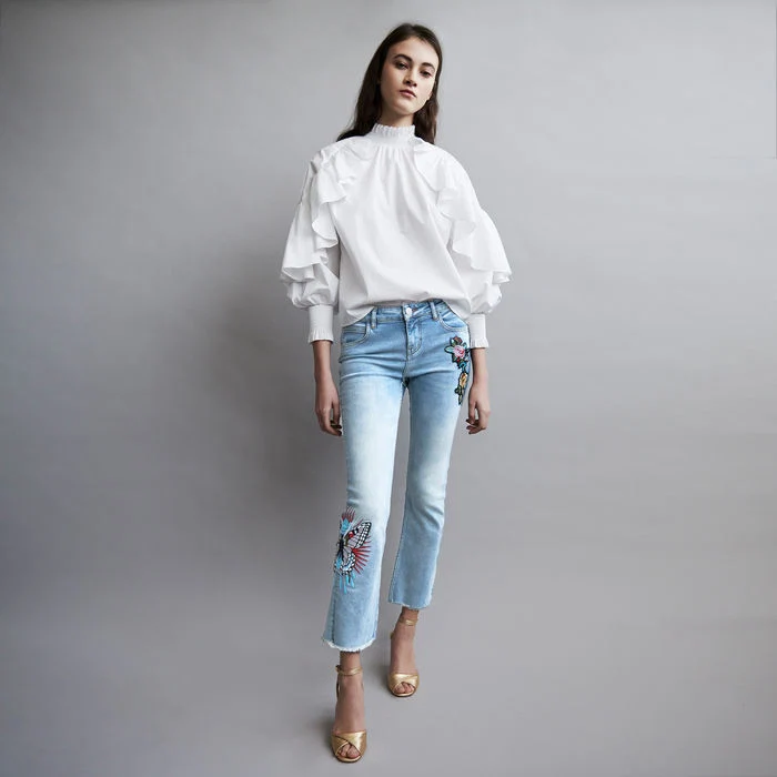 Try a pair of denims with embroidered detailing. These butterfly motif jeans from Maje have a lovely point of difference that elevates them above conventional denim. You could also buy felt patches in a haberdashery and sew or glue them (use fabric glue of course) onto your own jeans. All these denims need is a great pair of heels to make them perfect party wear. I absolutely love the frilled white blouse they’ve been styled with too.
