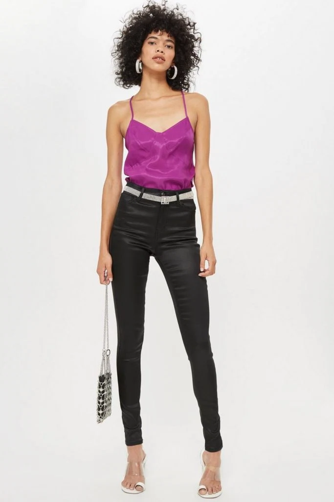 Skinny black satin-finish denim jeans create a strong party vibe when paired with a camisole top and sparkly belt. I would throw a black blazer over this to add a touch of sophistication.