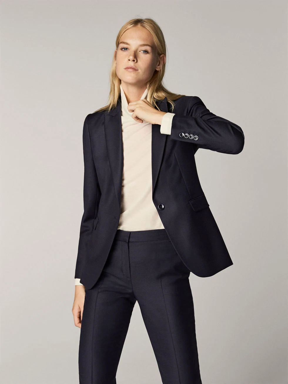 Slim fit navy blue textured jacket, €169; textured wool trousers, €79.95; both at Massimo Dutti