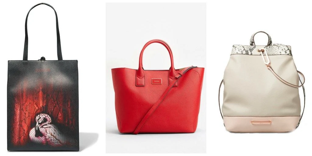 Left – right; Printed faux leather tote, Just Cavalli, €148.50,?Saffiano-effect red tote bag, Mango, €29.95,?Snake Trim Backpack, Calvin Klein, €190