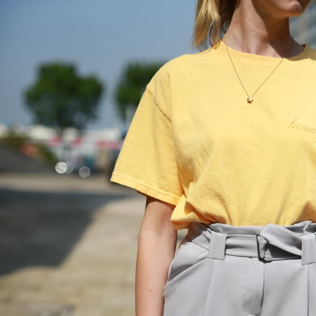 If you’re not yet ready to fully commit to head-to-toe yellow, why not colour-block? I love this soft yellow “Honey” top from BrandyMelville. The pastel shade teams perfectly with almost any colour!