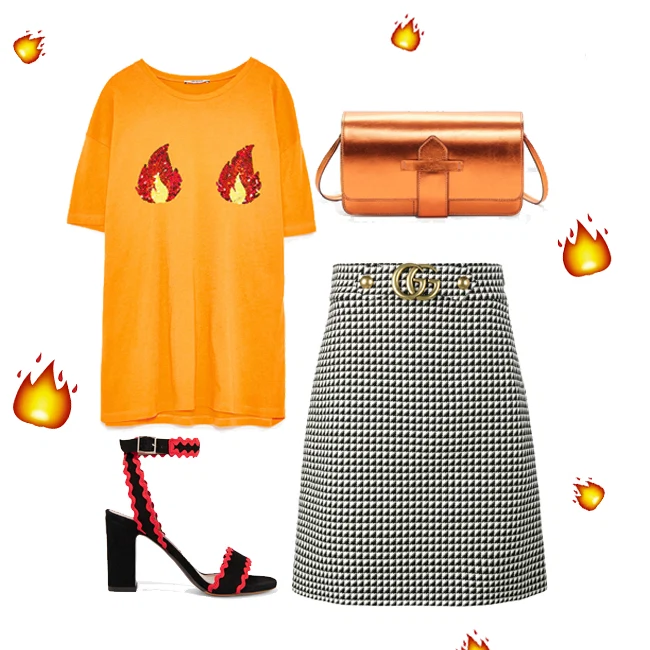 Sequinned flames t-shirt, Zara, €7.99,?Midi A-Line Dogtooth Print Skirt, Gucci, €790,?Tab Detail Leather Small Crossover, &OtherStories, €110,?Leticia rickrack-trimmed suede sandals, Tabitha Simmons, €495.