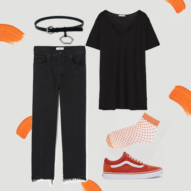 Premium relaxed jeans, Mango, €29.95,?Oversized Fishnet Ankle Socks In Peach, Asos, €2.03, Exaggerated Big Metal Ring Metal Hoop belt, Aliexpress.com, €5, short sleeve t-shirt, €12.95, Suede old school shoes, Vans.com, €80.