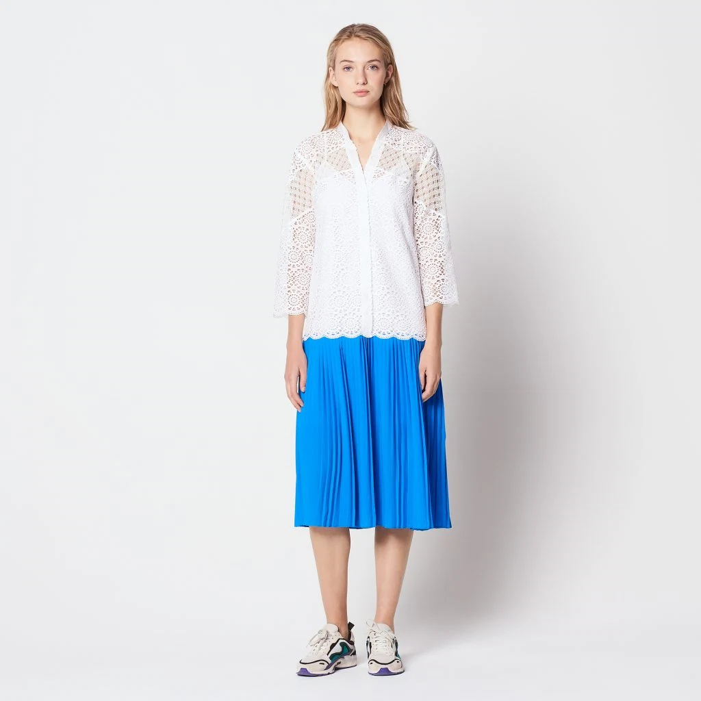 This looks like a two-piece but it’s actually a dress. The patchwork lace top looks so fresh and delicate, while the bright blue skirt injects this piece with a real modernity.