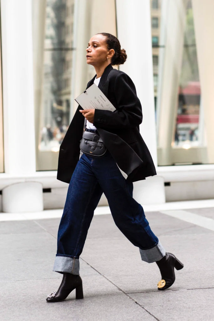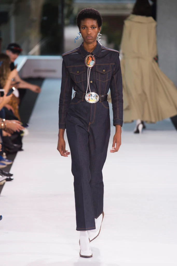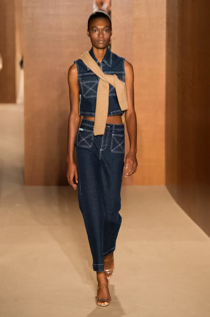 Toga and Alexa Chung served up deliciously deep tones of indigo denim this season, Chung adding crisp white visible stitching for a smart point of difference. In terms of designer brands, I’ve always loved the indigo washes from J Brand and have found they’ve washed beautifully over several years, only fading evenly and gently over time. Do remember that tailored doesn’t – and more often than not, shouldn’t – mean tight. Although Beckham chose a super fitted denim two-piece, I like to feel I can breathe in my jeans, so I’m leaning towards an inky hued pair of denims with a loosely fitted silhouette (such as the pair below). The slightly more louche fit looks chic and feels a little more contemporary. I’ll pair them with white boots for now.