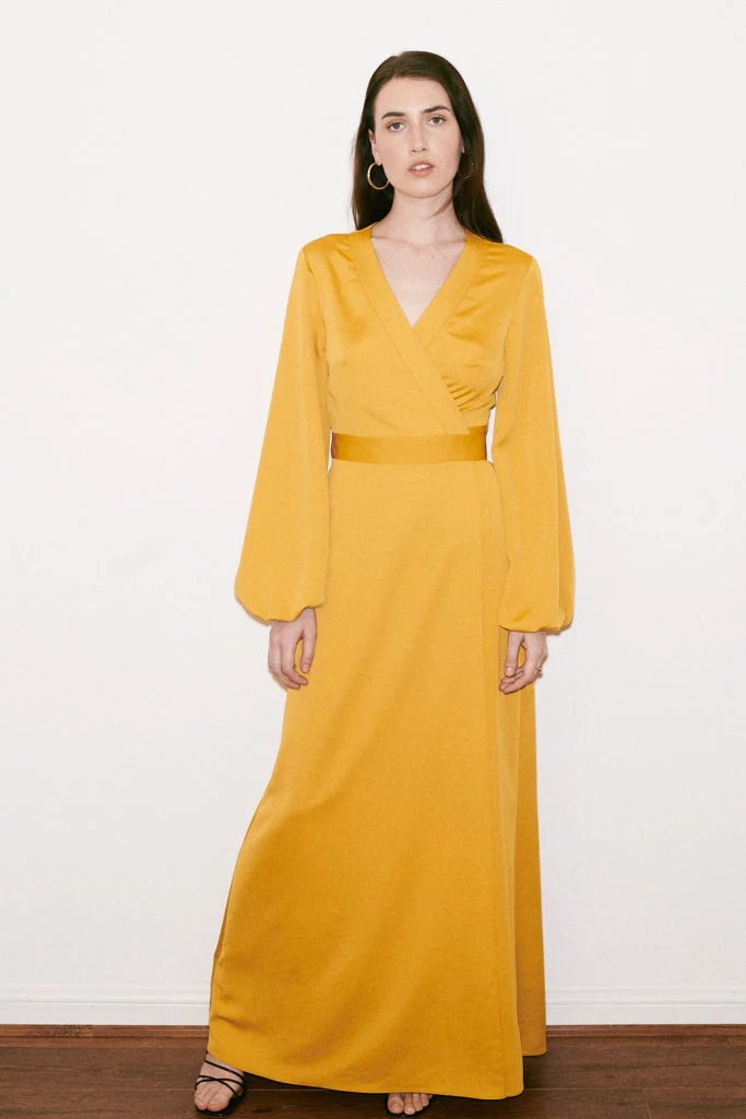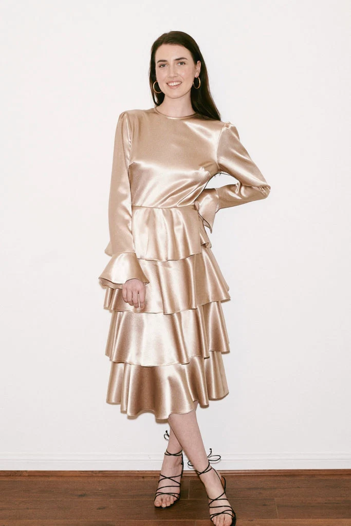 The dresses themselves are showstoppers. The ‘Claire’ satin ruffle midi dress is made from upcycled satin and is the type of dress you wear to a wedding and get inundated with “where did you buy” queries.