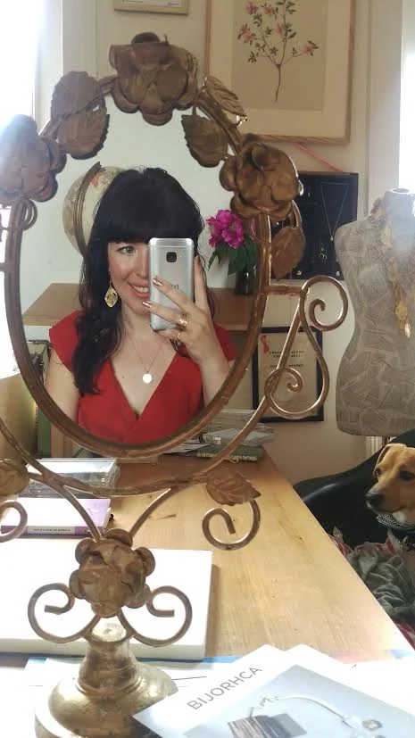 “Hats and sundresses were in order for some design time in the sun! Here I’ve thrown on my Thirteen Leaves in the Forest Necklace that instantly dresses up any outfit.”