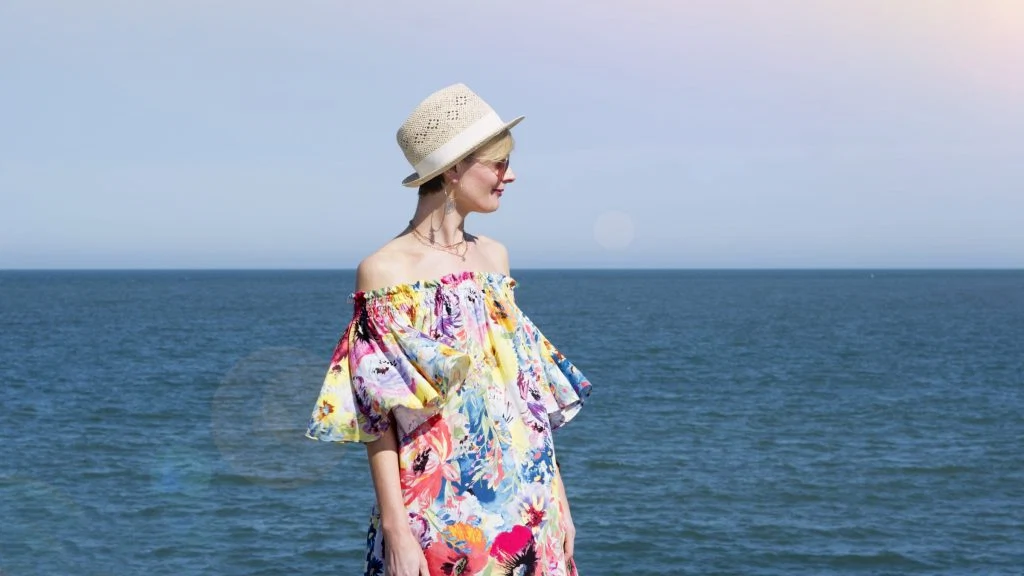 Fashion director Marie Kelly wears floral Bardot dress, €19.99, straw hat, €6.99, hoop earrings, €7.99, three-strand necklace, €7.99, sunglasses, €12.99