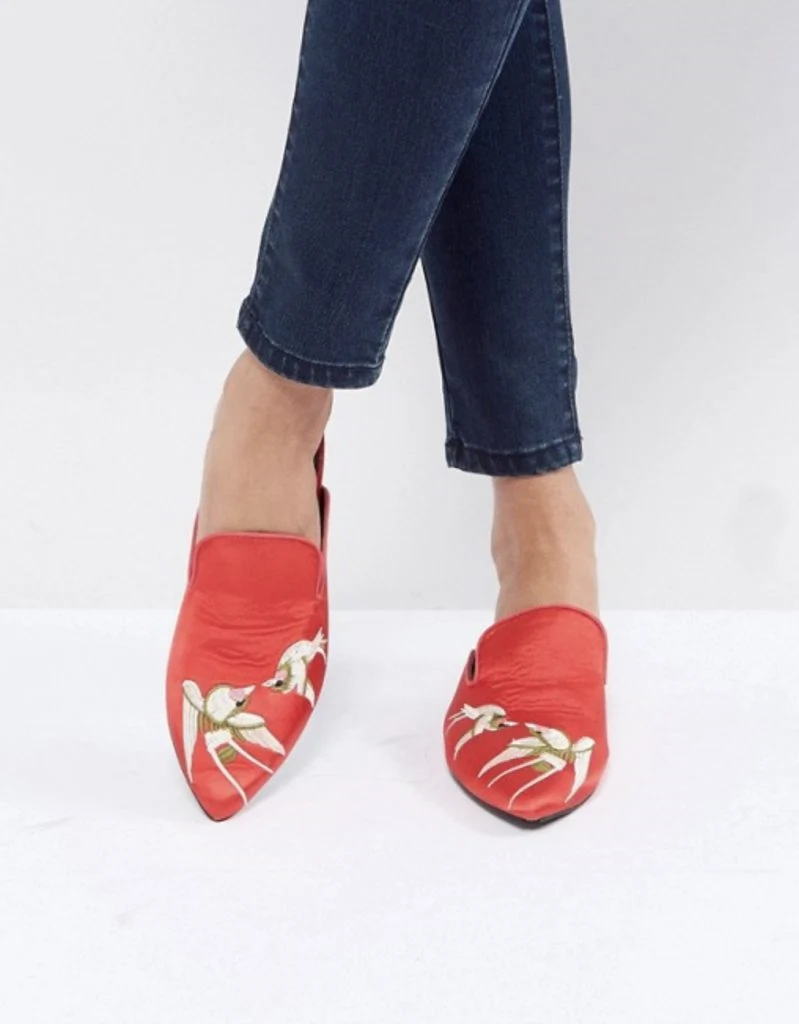 Asos’s footwear brand Raid takes inspiration from the catwalk and runs with it. These sateen mules in striking orange and bird-print applique are a beautiful springtime addition to your footwear collection.