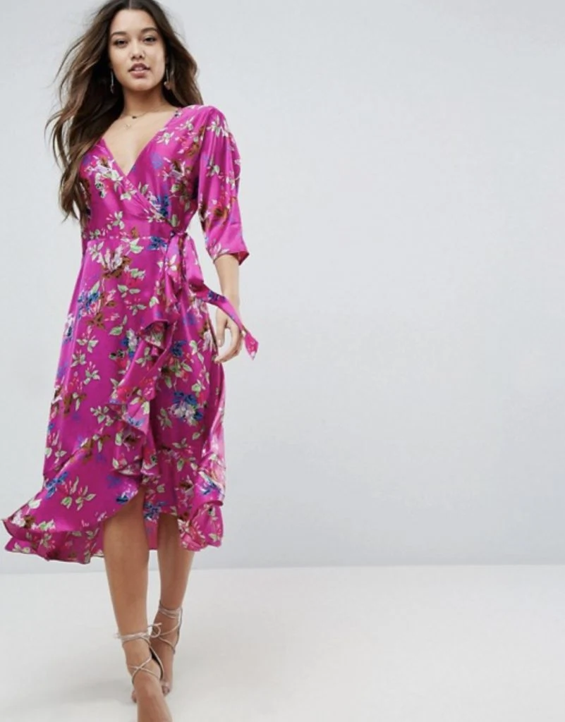 Wrap ruffle midi dress in floral print, €47.30 at asos.com