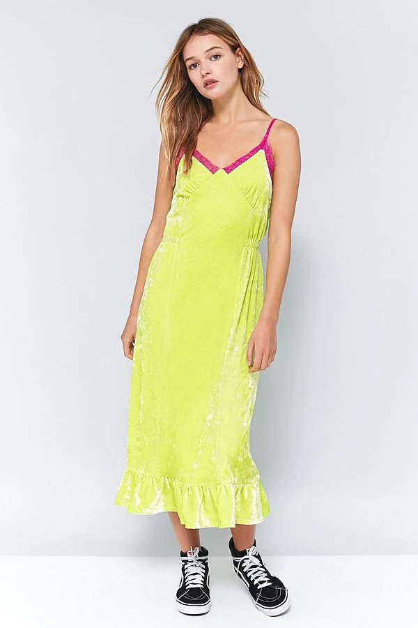 Choosing one strong, tonal statement piece like this vibrant yellow dress from Zara is a great option if you’re ready to try the acid trip trend. To start, it’s easier to wear and experiment with one solid statement piece instead of pairing together several styles and shades that you’re unsure of. Keep the rest of your outfit minimal and neutral. Pair with white heels for a look that says you’re ready for fun in the sun.