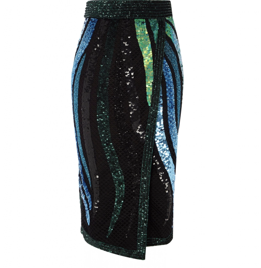 Green sequin embellished wrap midi skirt, €100 at Riverisland