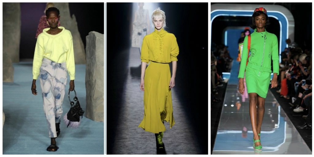 And it isn’t just London’s ostentatious fashionistas trying out this eye-popping trend: designers Ashley Williams, Hackerman and Moschino, to name a few, opted for flashier shades of lime green and yellow to pump up their catwalks.