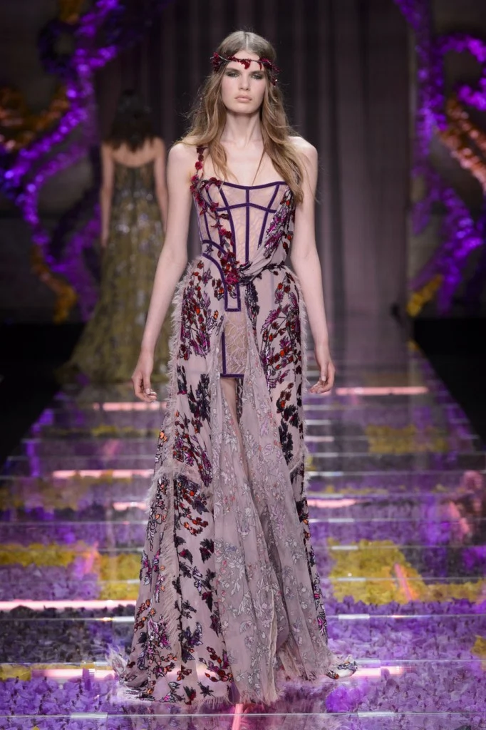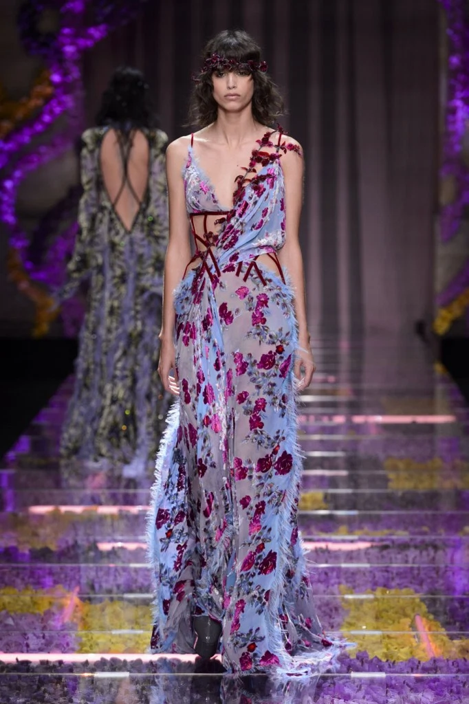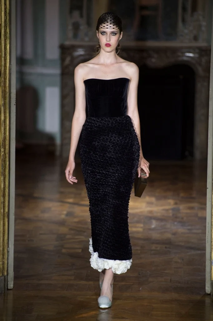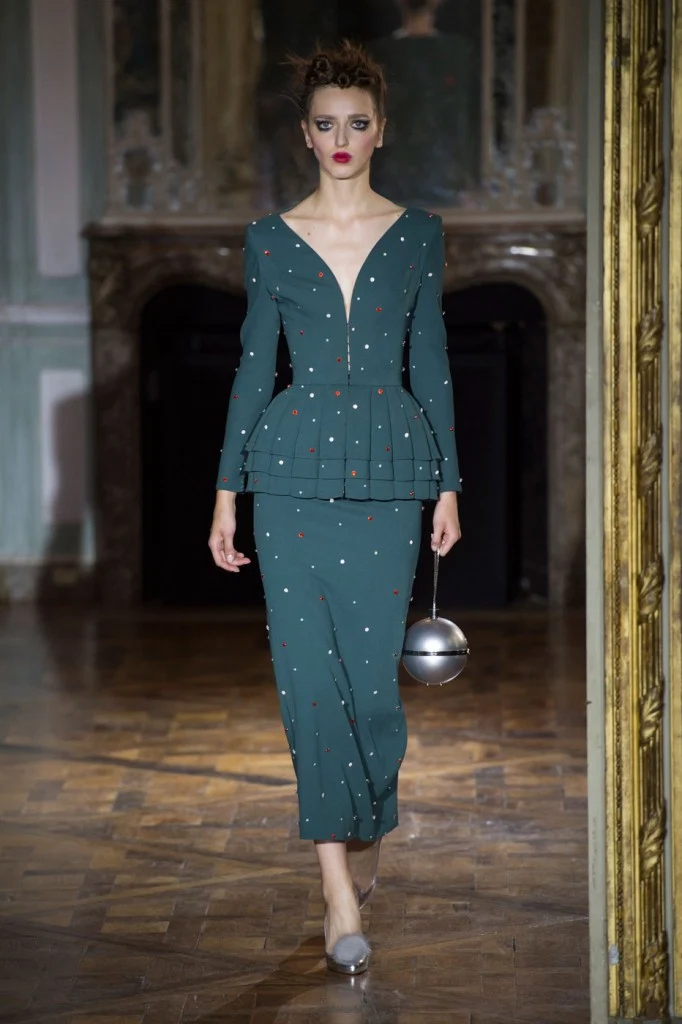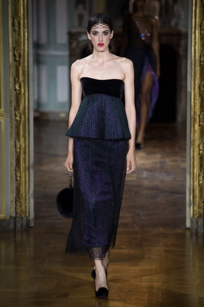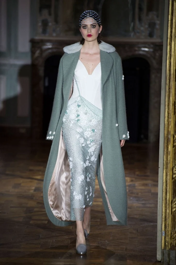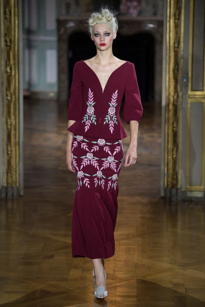Sergeenko went for a very fifties vibe with furs and velvet, tapered waists and fitted skirt suits with peplum jackets.?Atelier Versace was all about structured bodices and flowing chiffon, while ILJA had architectural contemporary structure and edge.