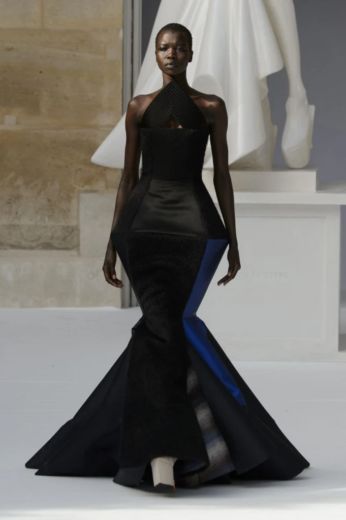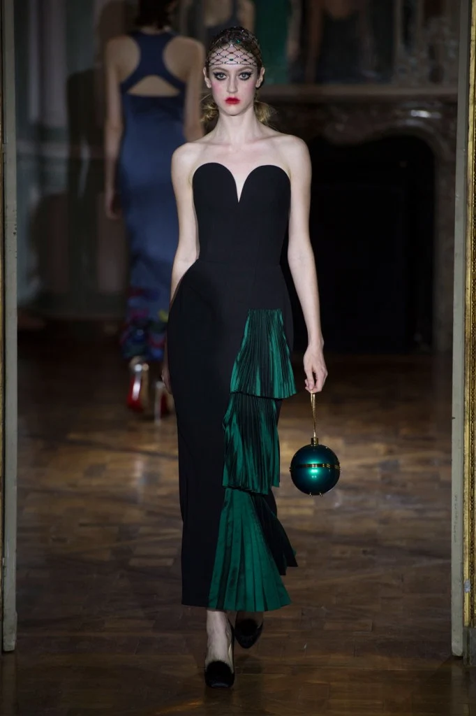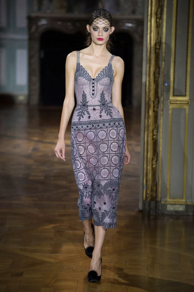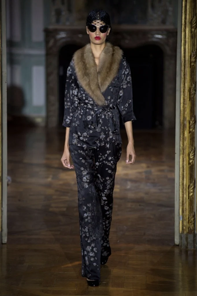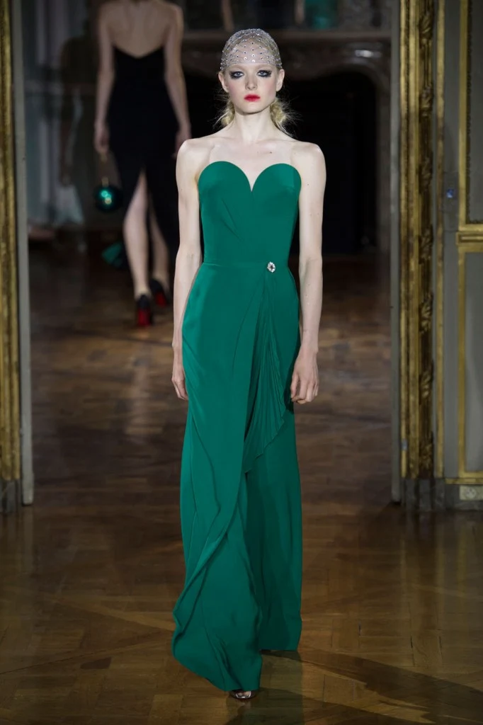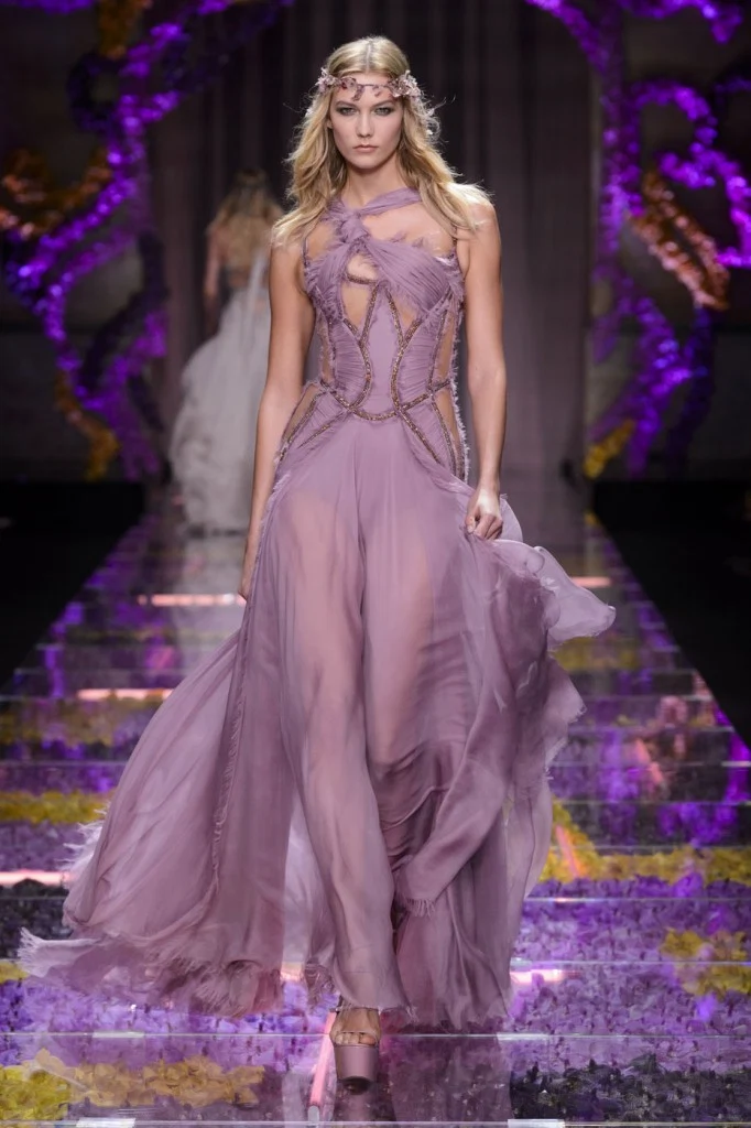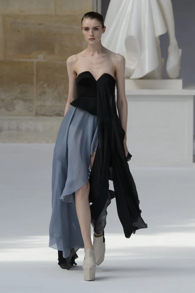 Sergeenko went for a very fifties vibe with furs and velvet, tapered waists and fitted skirt suits with peplum jackets.?Atelier Versace was all about structured bodices and flowing chiffon, while ILJA had architectural contemporary structure and edge.