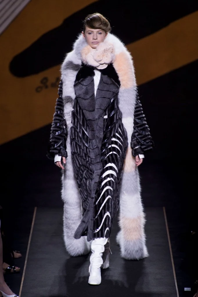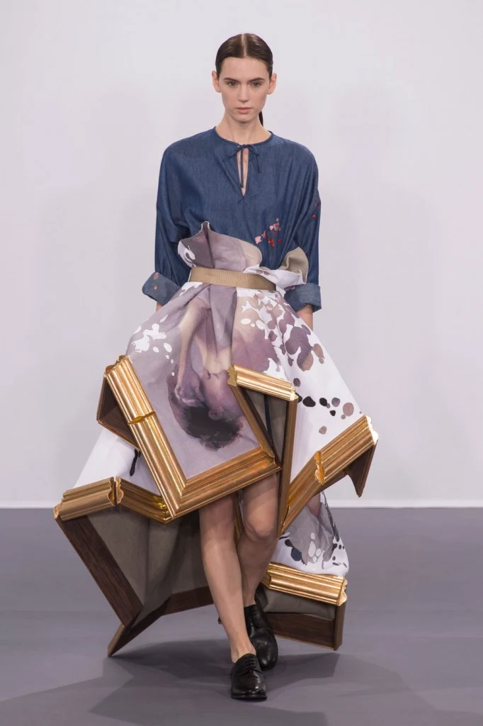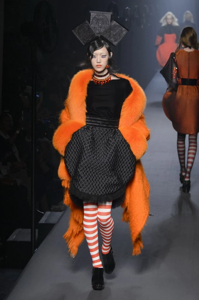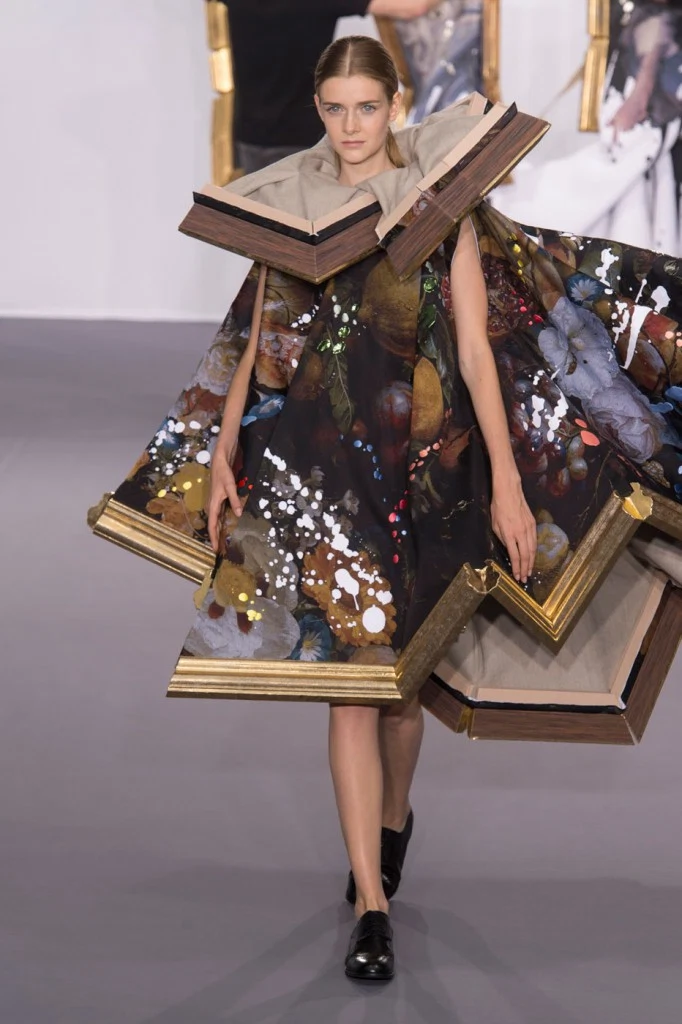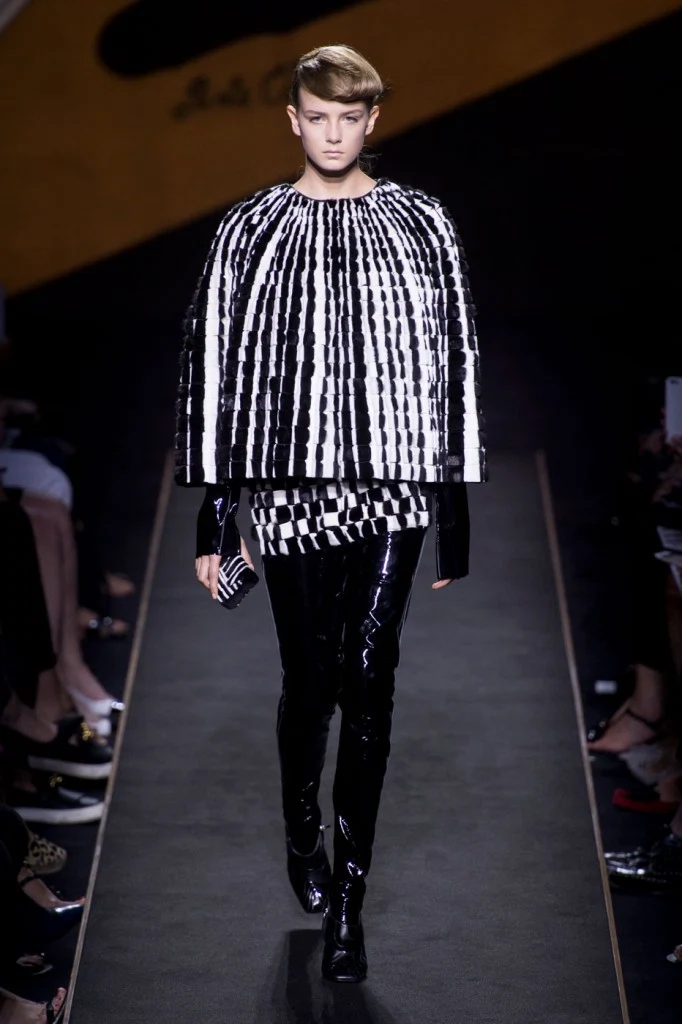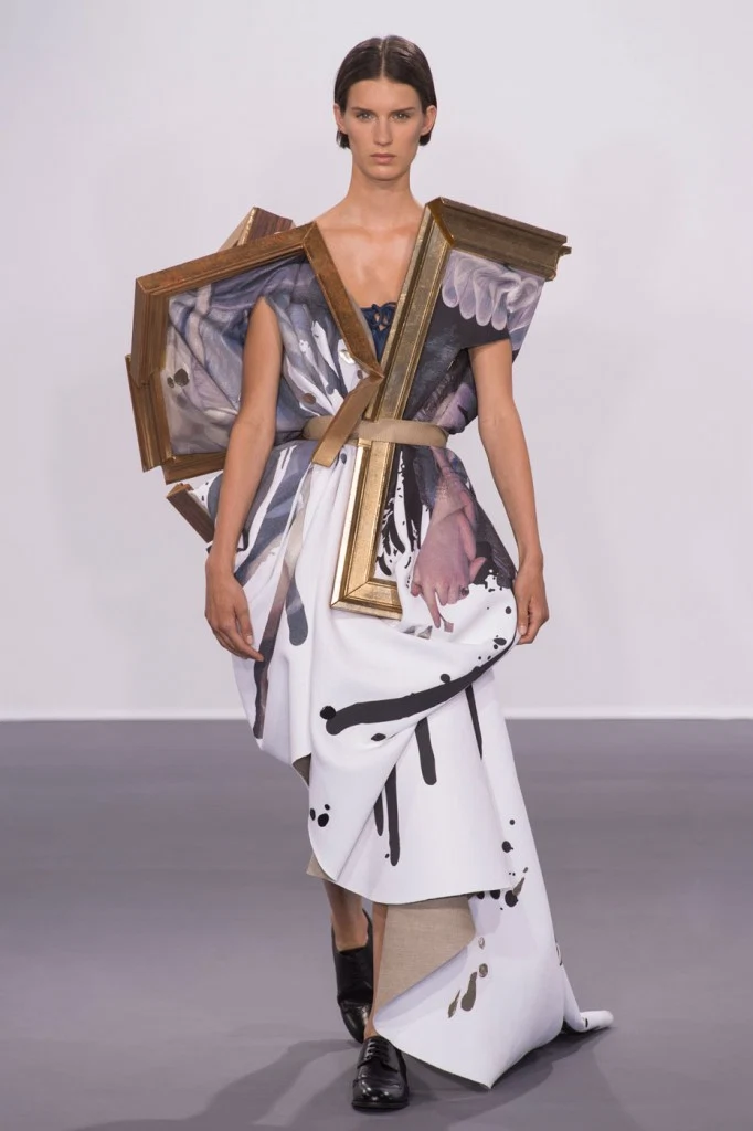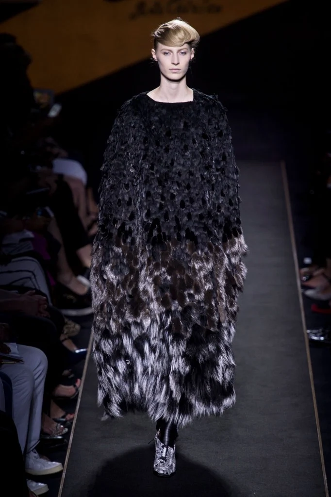Franck Sorbier’s set was a winter wonderland graced by ethereal ballerina in flawless white designs. Elie Saab went full Princess this season, with absolutely stunning gowns in golds, greens and burgundy, you can guarantee to see a few of them at the Emmys come September. Jean Paul Gaultier remained with fashions?that brought about his rise, including sailor stripes and tights with unusual circular skirts and intricate patterns. Viktor & Rolf took the artistic element quite literally as models pounded the runways wearing heavy printed fabrics edged with wooden frame pieces. As the show went on it became apparent it was some what of a puzzle as pieces were hung on the wall to create complete artworks. Fendi followed Elie Saab’s Disney theme but rather than Frozen princesses they went for Cruella DeVille with monochrome furs and feathers that sumptuously enveloped models.