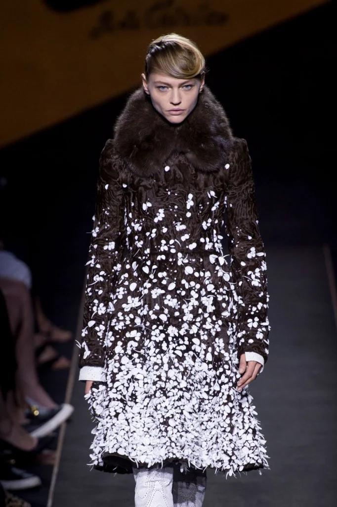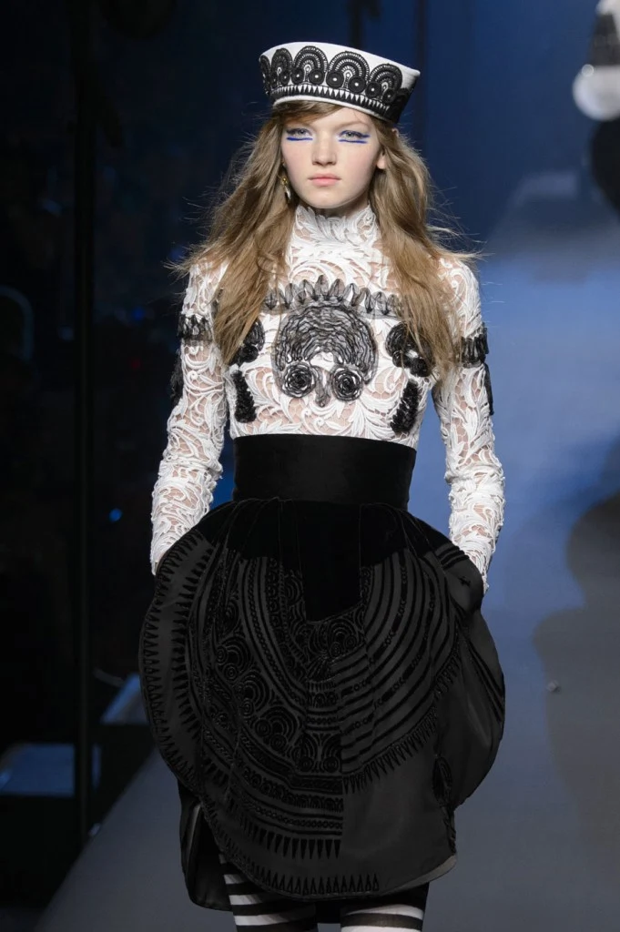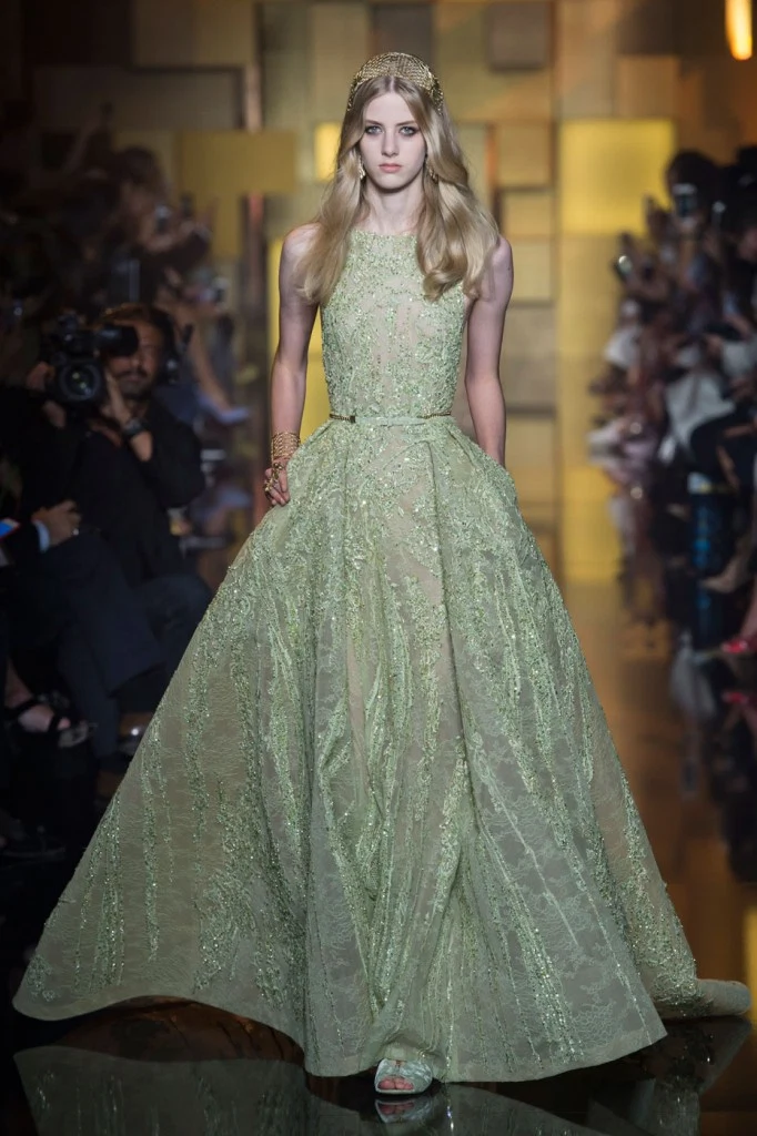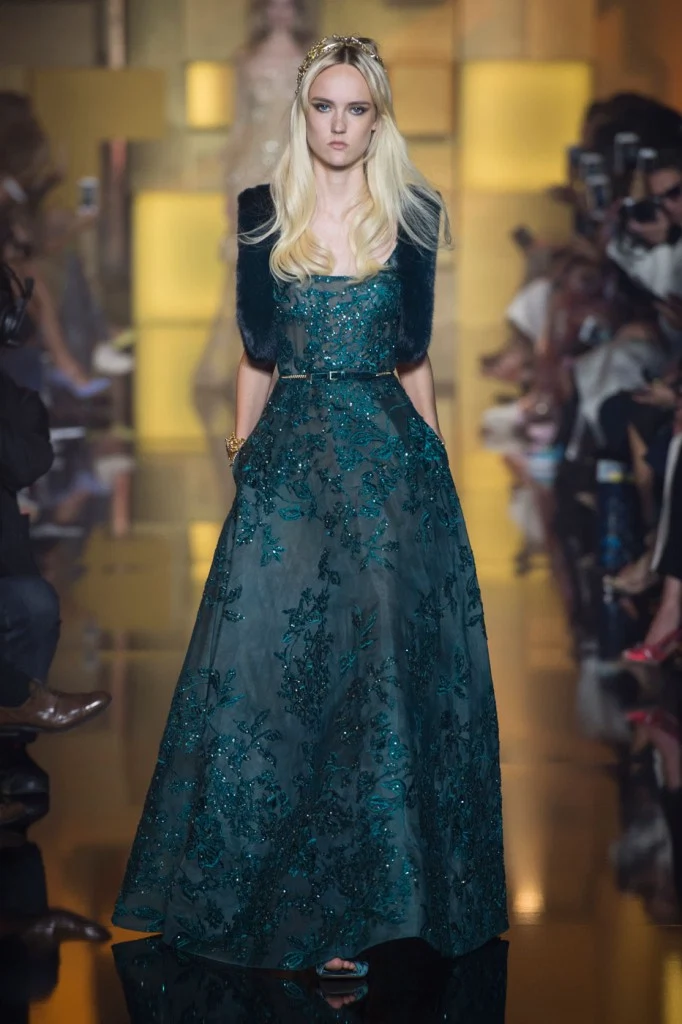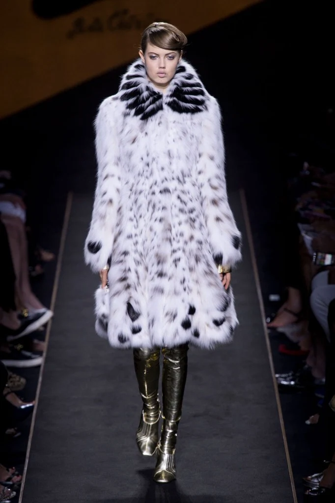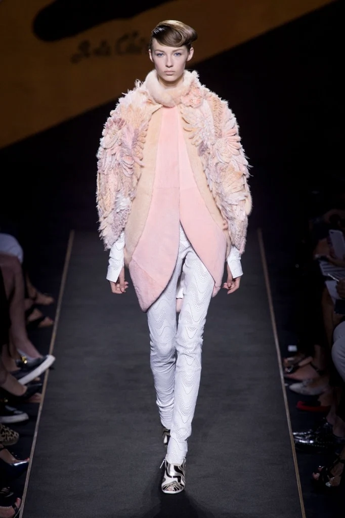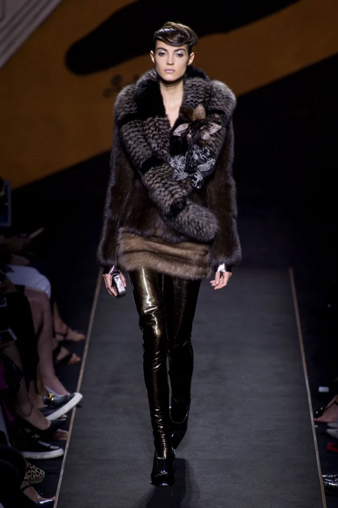 Franck Sorbier’s set was a winter wonderland graced by ethereal ballerina in flawless white designs. Elie Saab went full Princess this season, with absolutely stunning gowns in golds, greens and burgundy, you can guarantee to see a few of them at the Emmys come September. Jean Paul Gaultier remained with fashions?that brought about his rise, including sailor stripes and tights with unusual circular skirts and intricate patterns. Viktor & Rolf took the artistic element quite literally as models pounded the runways wearing heavy printed fabrics edged with wooden frame pieces. As the show went on it became apparent it was some what of a puzzle as pieces were hung on the wall to create complete artworks. Fendi followed Elie Saab’s Disney theme but rather than Frozen princesses they went for Cruella DeVille with monochrome furs and feathers that sumptuously enveloped models.