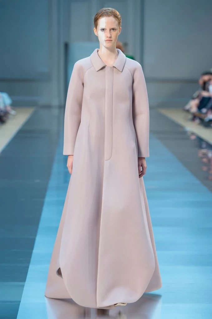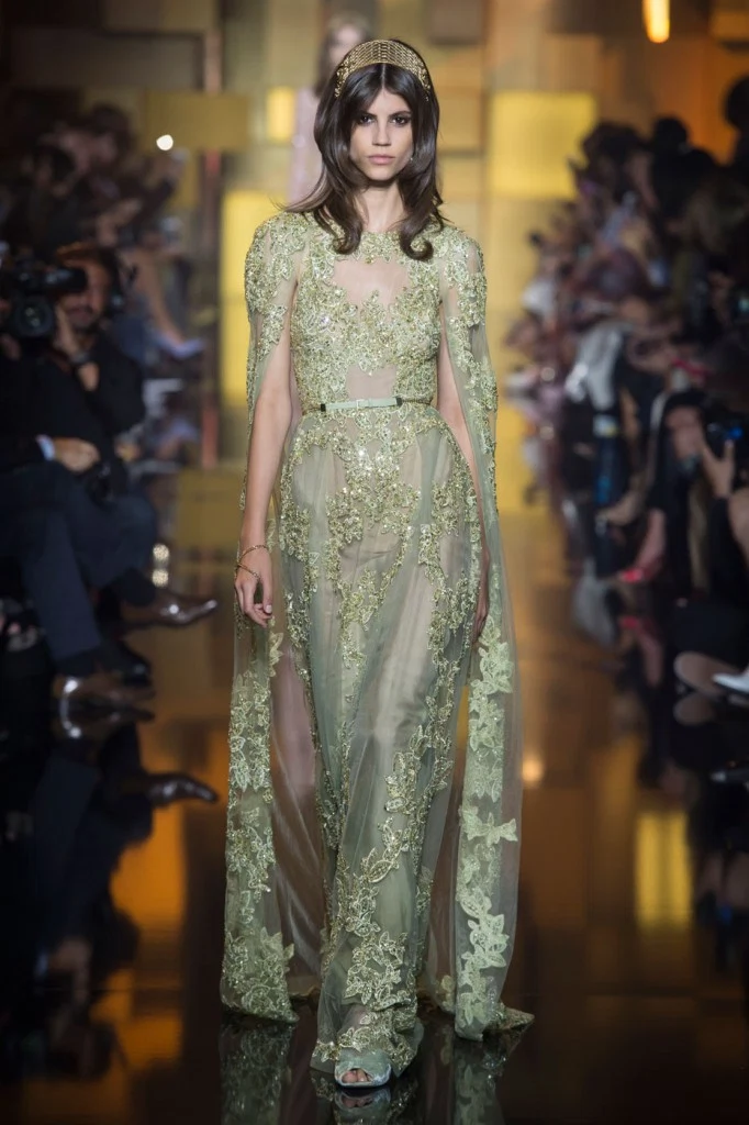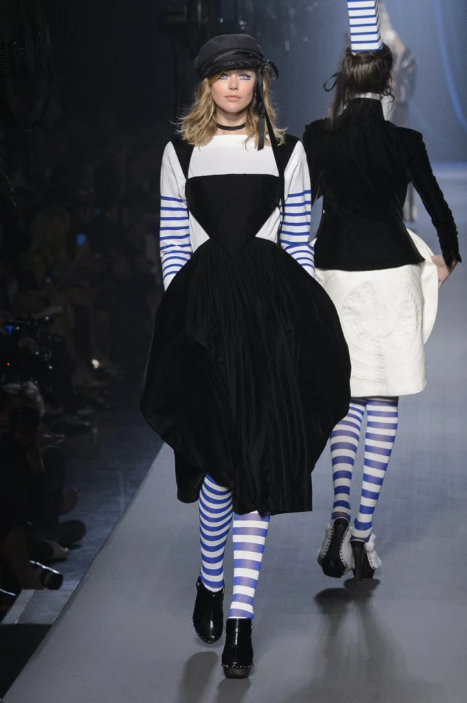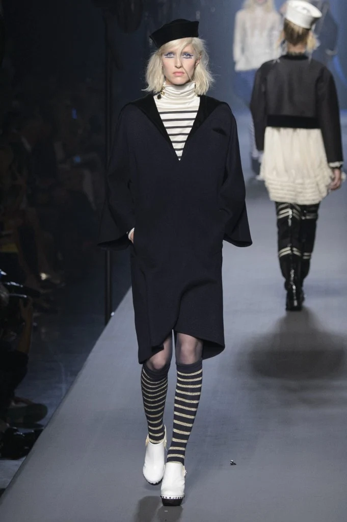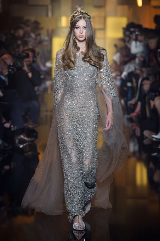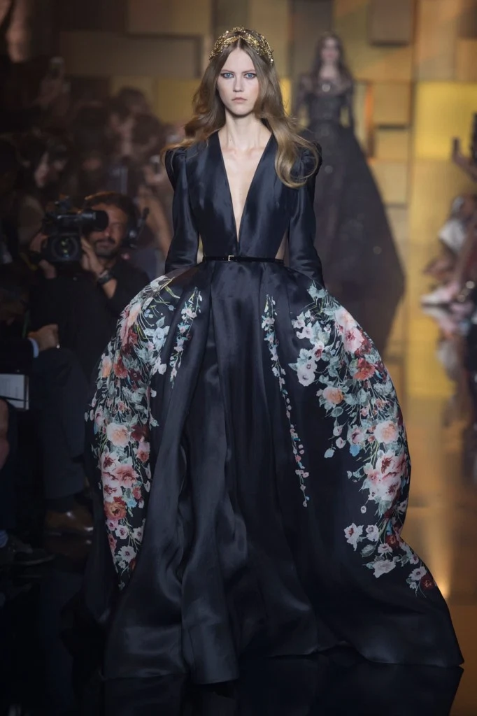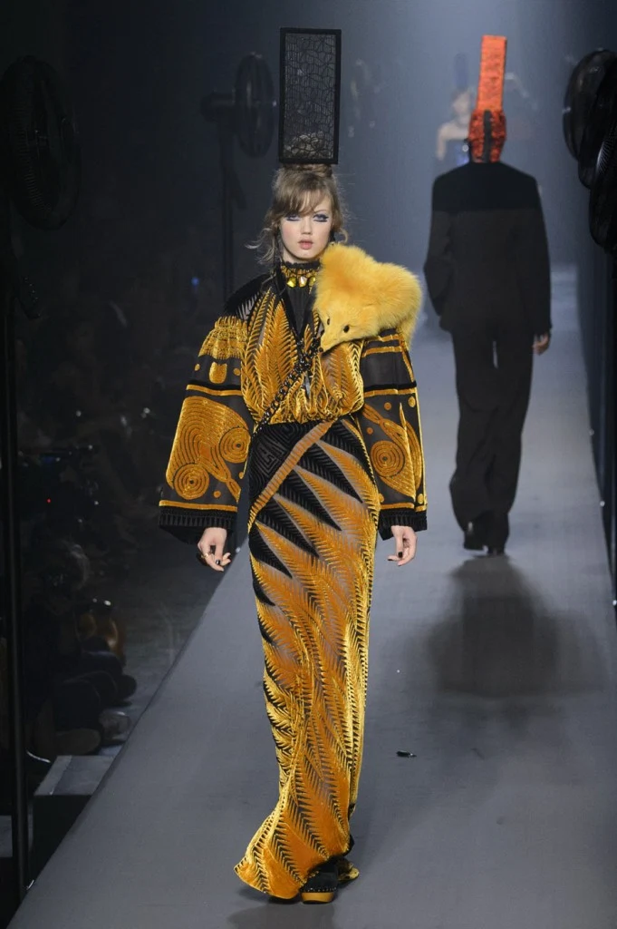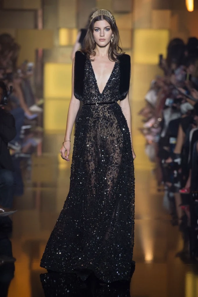 Franck Sorbier’s set was a winter wonderland graced by ethereal ballerina in flawless white designs. Elie Saab went full Princess this season, with absolutely stunning gowns in golds, greens and burgundy, you can guarantee to see a few of them at the Emmys come September. Jean Paul Gaultier remained with fashions?that brought about his rise, including sailor stripes and tights with unusual circular skirts and intricate patterns. Viktor & Rolf took the artistic element quite literally as models pounded the runways wearing heavy printed fabrics edged with wooden frame pieces. As the show went on it became apparent it was some what of a puzzle as pieces were hung on the wall to create complete artworks. Fendi followed Elie Saab’s Disney theme but rather than Frozen princesses they went for Cruella DeVille with monochrome furs and feathers that sumptuously enveloped models.