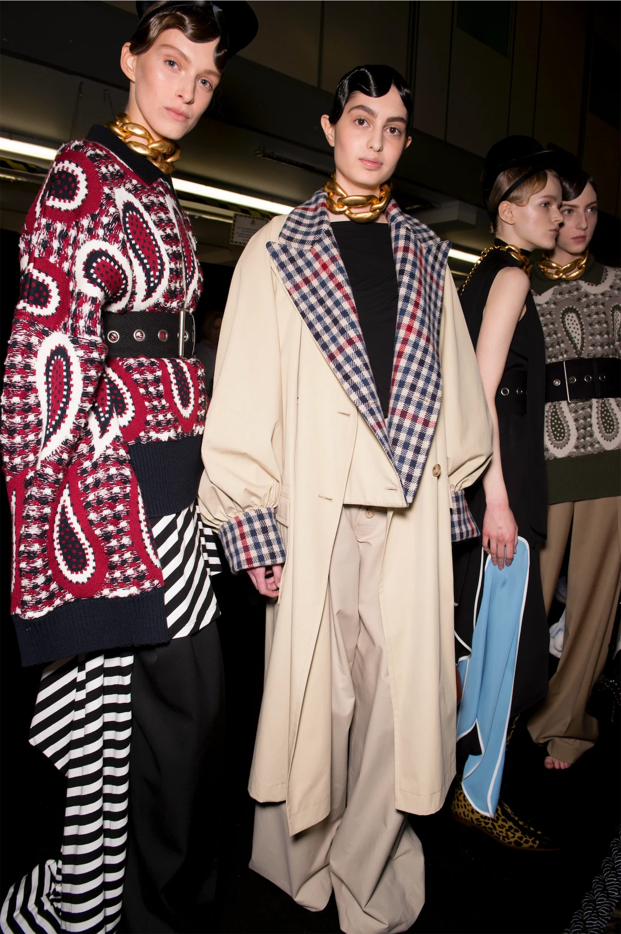 The Northern Irish designer delivered a truly forward-thinking yet wearable collection. Jackets with enormous batwing shoulders created distorted proportions that felt utterly fresh, while a deconstructed check-lined trench coat with oversized lapels and matching cuffs turned up on almost every international fashion feed, such was its originality. Large, chunky gold chain chokers and sparkling beaded brooches offered a punctuation to the equestrian-themed jockey hats worn as fascinators.