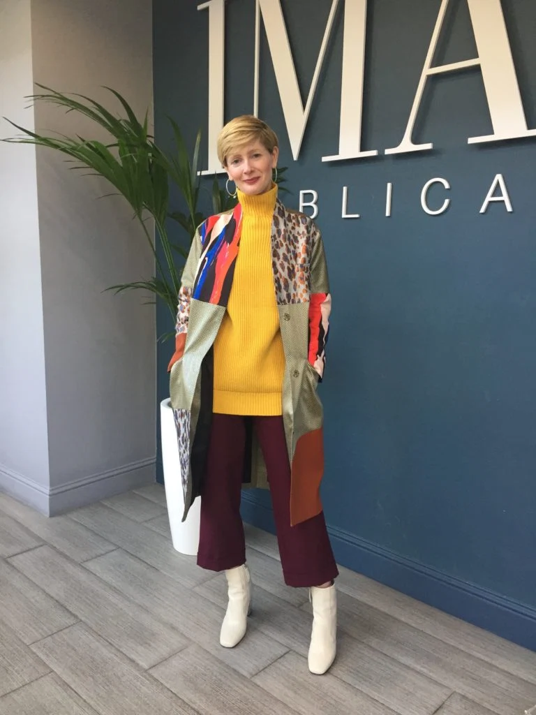 Fashion director Marie Kelly embracing colour in a Joanne Hynes coat, Victoria Beckham sweater, Zara trousers and Office shoes.