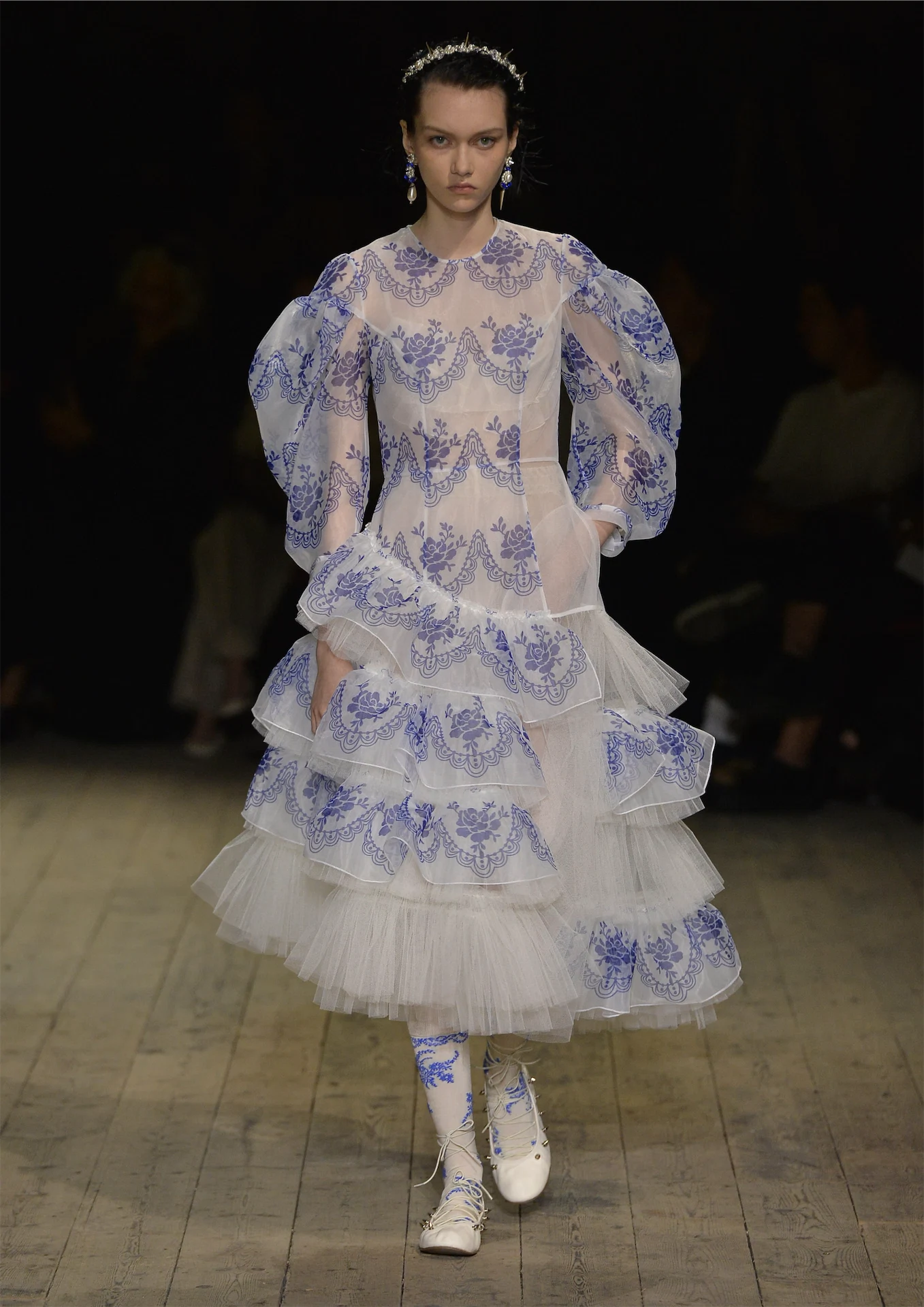 The show opened with faded blue Delph embroidered onto ivory tulle and printed scallops on organza patchwork, paired with spiked ballet slippers, sandals and Perspex heels. Tailoring was introduced through embroidered lace taffetas and technical trench cloths.