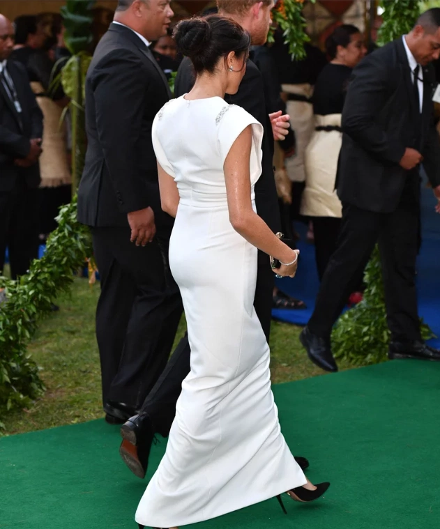 Meghan Markle stepped out in one of her most elegant fashion choices during her 16-day royal tour this week, wearing, much to our delight, a stunning full-length, embellished-shouldered gown by Irish designer Don O’Neill.