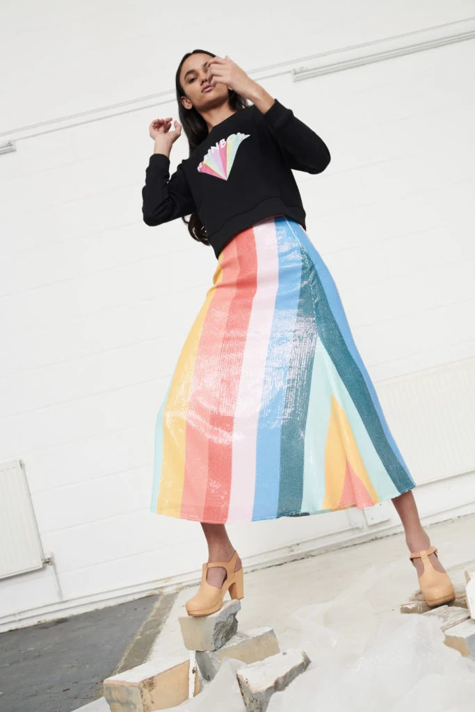 Olivia Rubin is a clothing brand to make you smile. Feminine shapes are complemented by sequins, bold colours and graphic prints, with rainbow stripes the print du jour. The pieces are surprisingly easy to wear. Sequin skirts and dresses work just as well with trainers for a casual Sunday as they do for a summer wedding. These pieces promise to brighten up the darkest of days.