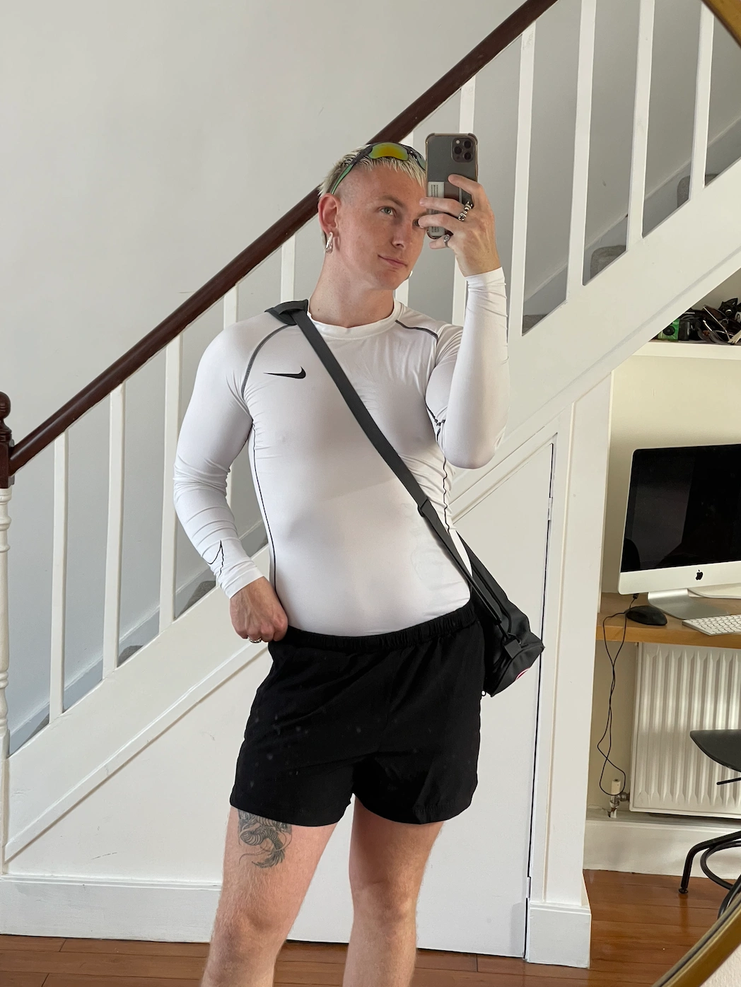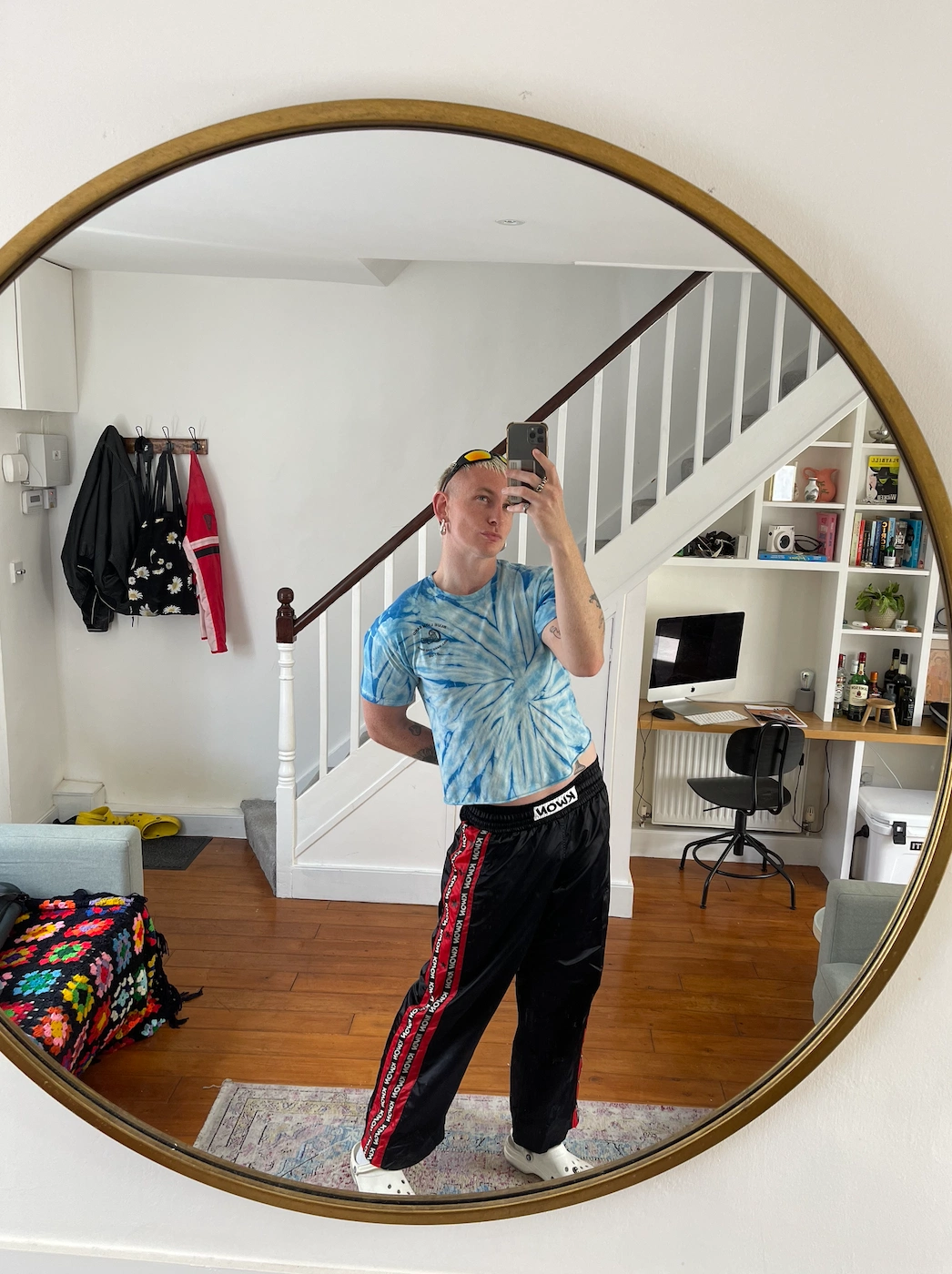 Ok, so it’s Monday… i.e. time to do some work because the Sunday fear had me up to 90 the night before. All my work is on the computer today. Editing, recording and virtual meetings are on the schedule so I’m going to keep it comfy. It’s giving sort of a gay street fighter fantasy and I’m here for it. I decided to wear this today because I wore it before so I didn’t need to think about “putting it together”, and also it was clean. The washing basket is full and it’s stressing me out. The cropped tie dye top and silk pants (that I think professional fighters wear) are from vintage shops in Brick Lane in London. The shoes are Crocs because I’m addicted to them and the glasses are from Regatta Great Outdoors in the Ilac Centre.