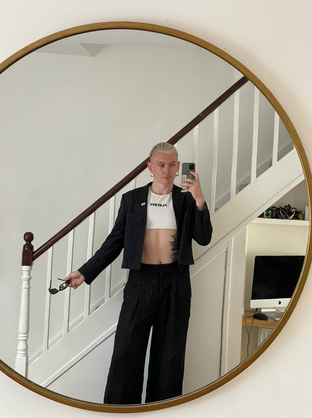 After a day in fitness gear, I wanted to get a bit dolled up today. I think fashion is just about having a skit and expressing yourself in whatever way feels authentic to you. I like taking things that are stereotypically “masculine” and remixing them into something that feels more me. I thrifted this suit jacket and got it cropped by the lovely people at The Zip Yard and then paired it with a cropped Playboy top because why not, you know? The pants are from the COS women’s section and I am so obsessed with them that I got them in another colour. The high waist is so flattering, they’re lightweight and are so versatile, 10/10 would recommend.