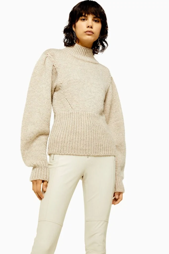 This funnel neck jumper from Topshop will be extremely flattering on all body shapes. Its cinched-in waist will create a beautiful structure, while its balloon-style sleeves also help to accentuate our narrowest part.