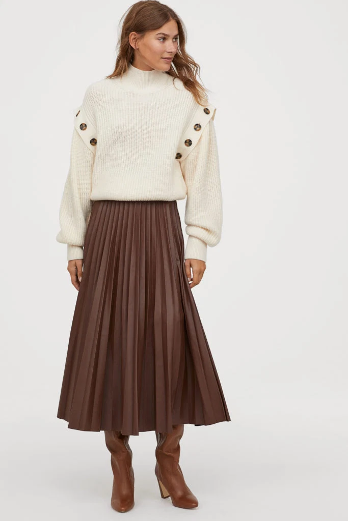Like the midi-dress, the midi skirt is a wardrobe enigma. Providing versatility and style kudos in abundance, it’s a no-brainer purchase. This dark brown vision from H&M will provide elongation and shape and will look luxurious when worn with knee-high boots and a beautiful knit.