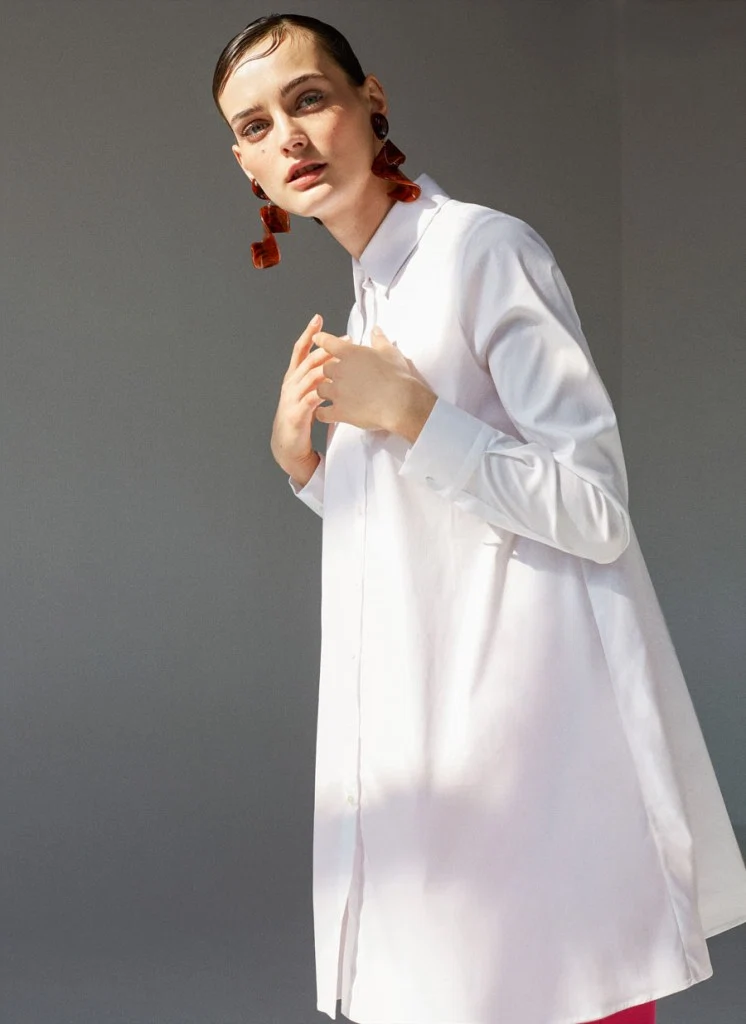 This tunic-style shirt is sort of a shirt/shirtdress hybrid. I love the simplicity of it. The A-line shape feminises it, balancing the slightly austere button-front style.