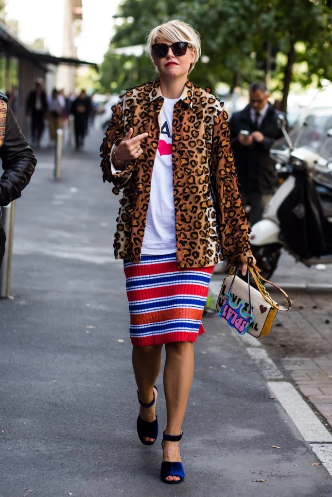 Pairing red and white stripes with animal print is the exact opposite of what you think actually would work. But this outfit looks superb: modern and utterly original. Note to self, must buy more animal print.