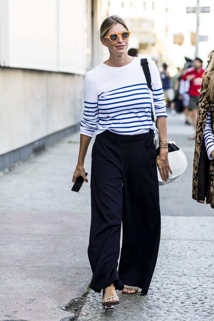 A simple striped top and palazzo pants always look understatedly chic in summer. Adding a pair of quirky sunglasses, however, gives this outfit the edge it needs to ignite our interest.