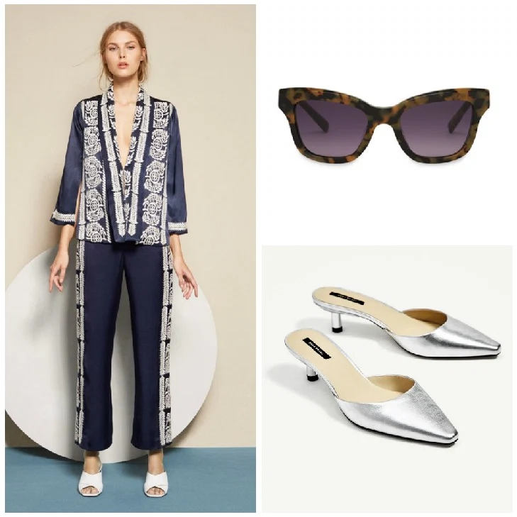 Straight-cut embroidered trousers, €110 at Uterq?e.?Kat angluar frame sunglasses, €105 at Whistles.?Silver-toned leather high heel mules, €45.95 at Zara.