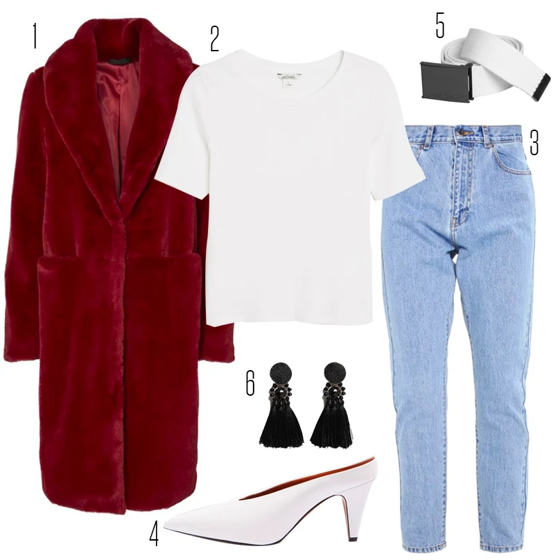 1.Vero Moda long faux fur jacket, €102.34 at Asos, 2. ribbed cotton tee, €6 at Monki.com, 3. Nora light retro jeans, €70 at drdenimjeans.com, 4. juicy V-Cut mules, €34 at Topshop.com, 5. urban classics canvas white belt, €6.90 at Fruugo.ie, 6. tassels pendant earrings, €12.95 at Mango