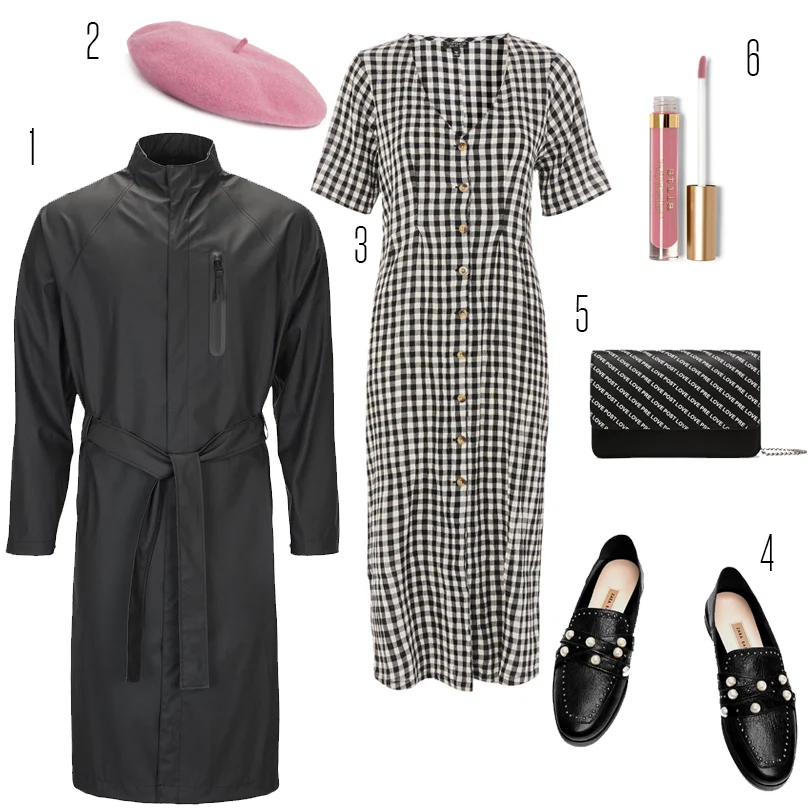 1. lance coat, €107.36 at Rains, 2. pink beret, €17 at River Island, 3. gingham midi dress, €52 at Topshop, 4. leather loafers with pearl beads, €55.95 at Zara, 5. slogan print cross-body, €19.95 at Zara, 6. Stay All Day sheer liquid lipstick, €17.73 at stilacosmetics.com
