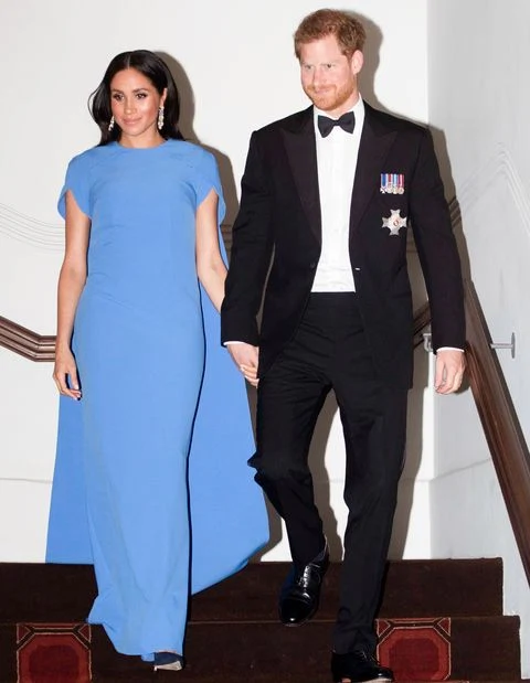 Here she wears a Fijian blue caped Safiyaa gown for a state dinner at the Grand Pacific Hotel hosted by the President of Fiji.