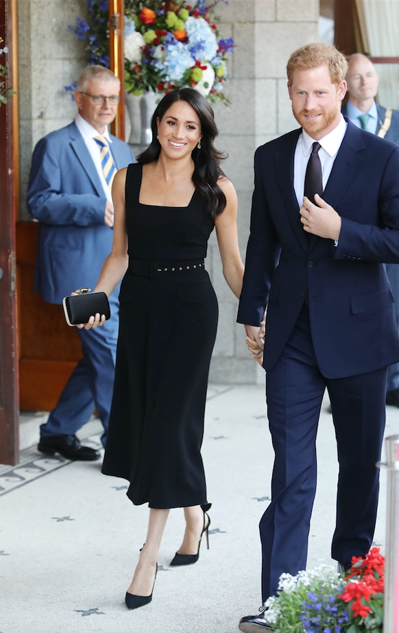 That same visit, Markle chose a sleeveless square neck Emilia Wickstead dress and black pumps for at British Ambassador’s residence in Dublin.