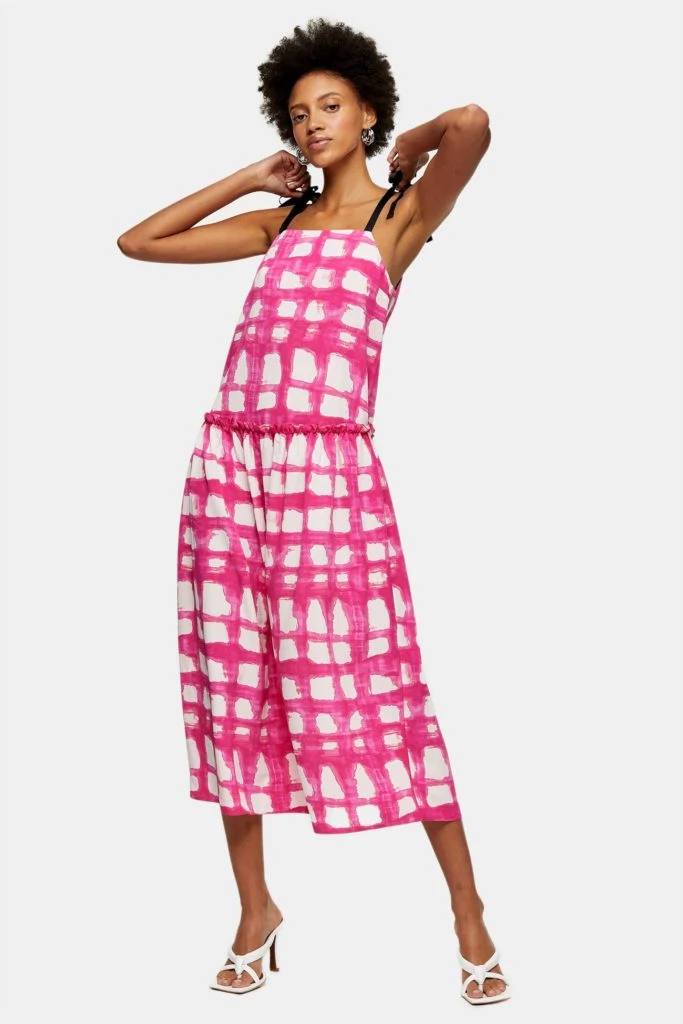 Pink check tie tiered drop waist midi dress, €49 at Topshop